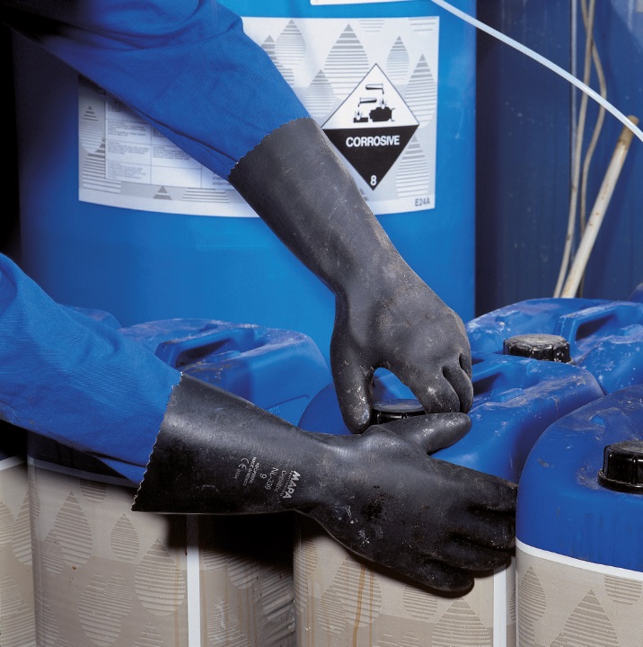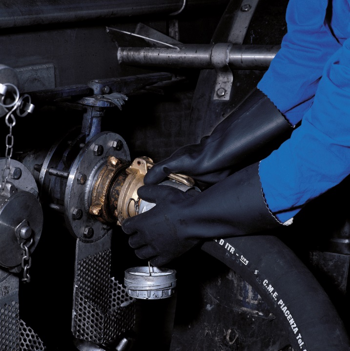 High physical and chemical protection with high wearing comfort. Application: Especially against acids of high concentration (hydrofluoric acid, sulphuric acid), bases, oils, grease and solvents. Petrochemistry, use of resins, chemical accidents, surface treatment of metal (acid), stripping of sheets and metals, manufacture chemisFIXEDLENGTH.