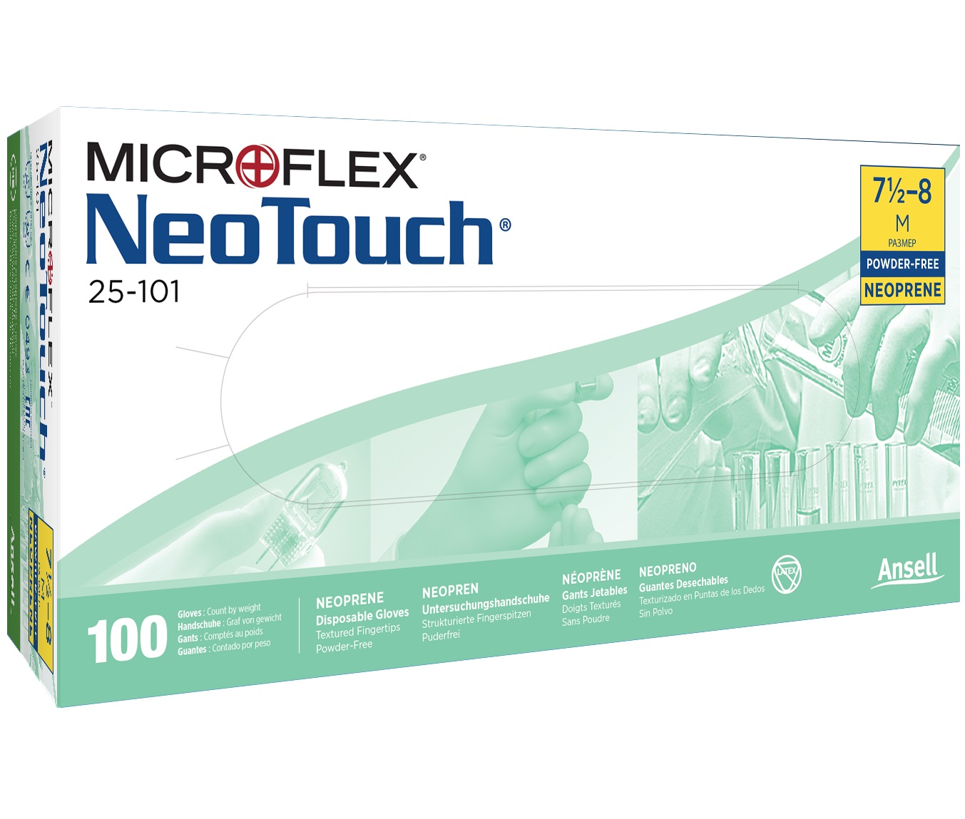 The Microflex® NeoTouch® gloves were the first neoprene disposable gloves for industrial work. By avoiding natural latex, the gloves in the Microflex® NeoTouch® range are suitable for protection against type I allergies. Their powder-free nature limits the risk of dermatitis. They offer excellent protection against acids, bases and alcohols. Their exclusive formulation makes Microflex® NeoTouch® gloves convincingly the most comfortable disposable synthetic gloves on the market today. The PU inner coating of Microflex® NeoTouch® gloves ensures easy on/off. Their textured fingertips provide a secure dry and wet grip. The rolled edge provides a secure fit and their green color simplifies their identification. Microflex® NeoTouch® gloves have an AQL of 1.5 for micro-holes. This meets the regulatory requirements for medical gloves.