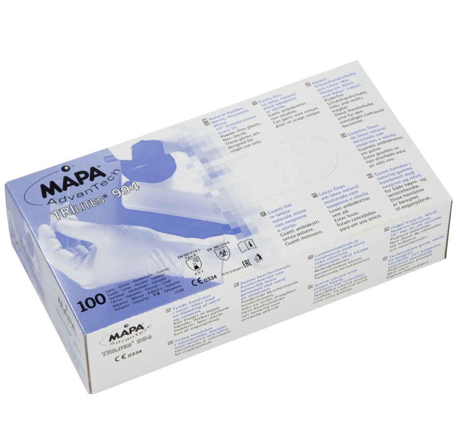 The MapaTrilites 994 is a unique glove thanks to an exclusive tri-polymer blend that combines the advantages of natural latex, neoprene and nitrile. Elastic, tear-resistant and increased resistance to chemical splashes. High comfort due to flexibility and good fit. Grained fingertips for optimized grip. Excellent dexterity, excellent tactile sensitivity. No protection against mechanical risks. Application For laboratory work, lamp assembly, treatment of precision parts.