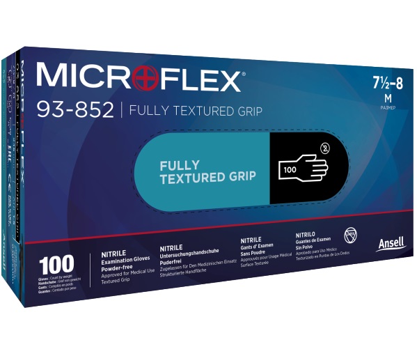 The black color of the glove hides stains and forms a contrasting background for recognizing materials of a lighter color. The Microflex 93-852 is characterized by a higher tensile strength compared to the standards of ASTM D6319 and EN 455. The hands can move freely and comfortably when wearing the glove. The completely textured structure without foam cushioning allows the glove wearer a firm wet grip when handling objects. The latex and powder freedom of the glove bewahrt protects the skin from a type I allergy, irritation or dehydration.The gloves meet the requirements of Regulation (EC) 1935/2004 on "materials and articles intended to come into contact with food" and Regulation (EC) 2023/2006 on "good manufacturing practice for materials and articles intended to come into contact with food".Areas of application: Analytical tests/measurements, Biotechnology, Filtering processes, Food processing, Laboratory analysis, Laboratory testing, Light assembly work, Light assembly of oily par