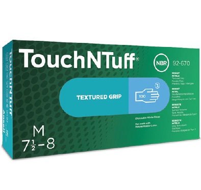 The AnsellTouchNTuff Blue 92-670 is a disposable glove made of nitrile rubber. Only 0.1 mm thick, yet surprisingly resistant, resistant to oils and petrol. Suitable for short-term contact with chemicals (splash protection), 100% latex-free, no latex allergy risk, powder-free, structured, AQL 1.5 The TouchNTuff Blue 92-670 is suitable for laboratory work, the chemical industry, ultra-fine assembly, product protection. The gloves meet the requirements of Regulation (EC) 1935/2004 on "materials and articles intended to come into contact with food" and Regulation (EC) 2023/2006 on "good manufacturing practice for materials and articles intended to come into contact with food". Standard: EN 374 Protection class: Cat. IIIColour: light blueMaterial: 100% nitrile rubberLength: approx. 240 mmThickness: approx. 0.12 mmPacking unit: 1 box = 100 pieces / PU= box a 10 boxes