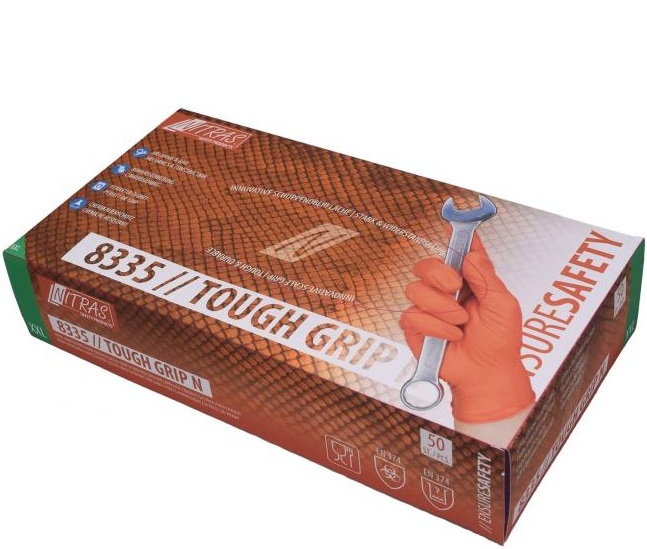 NITRAS TOUGH GRIP N, nitrile disposable gloves, orange, non-sterile, rolled edge, powder-free, innovative scaly surface for a particularly strong grip on wet and dry surfaces, excellent fit, particularly robust, for food contact, ambidextrous, AQL 1.5.