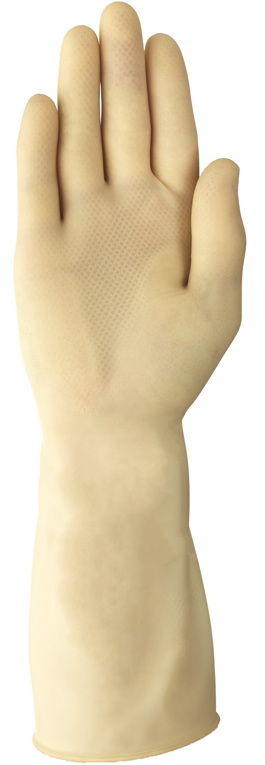 Unlined glove with rolled edge made of natural rubber latex. Not velour coated. Good tear resistance. Strong protective layer and yet sensitive. Rolled cuff for easy donning / doffing and good tear resistance: Excellent flexibility, comfort and finger dexterity.