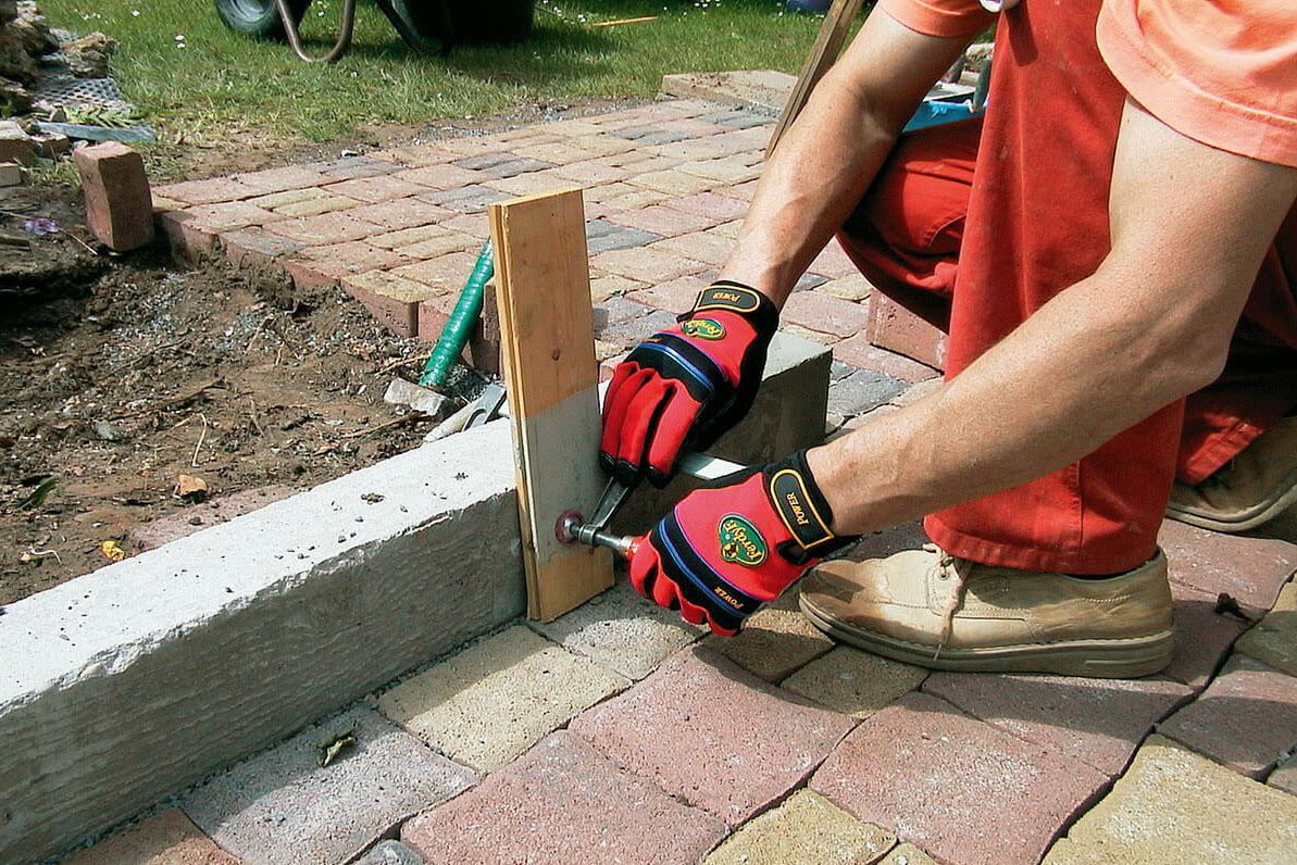 All-round glove for use in interior design, timber construction, assembly, machine and material handling, padded red elastane back, knuckle protection made of chloroprene rubber, terry cotton sweat absorber, perfect fit, secure hold, good wearing and tactile feel enables long wearing times, maximum protection and wearing comfort, palm made of breathable waschbarem Clarino® synthetic leather, breathable inserts between the fingers.