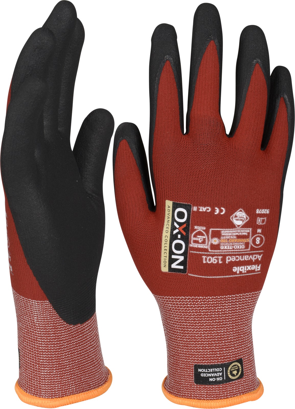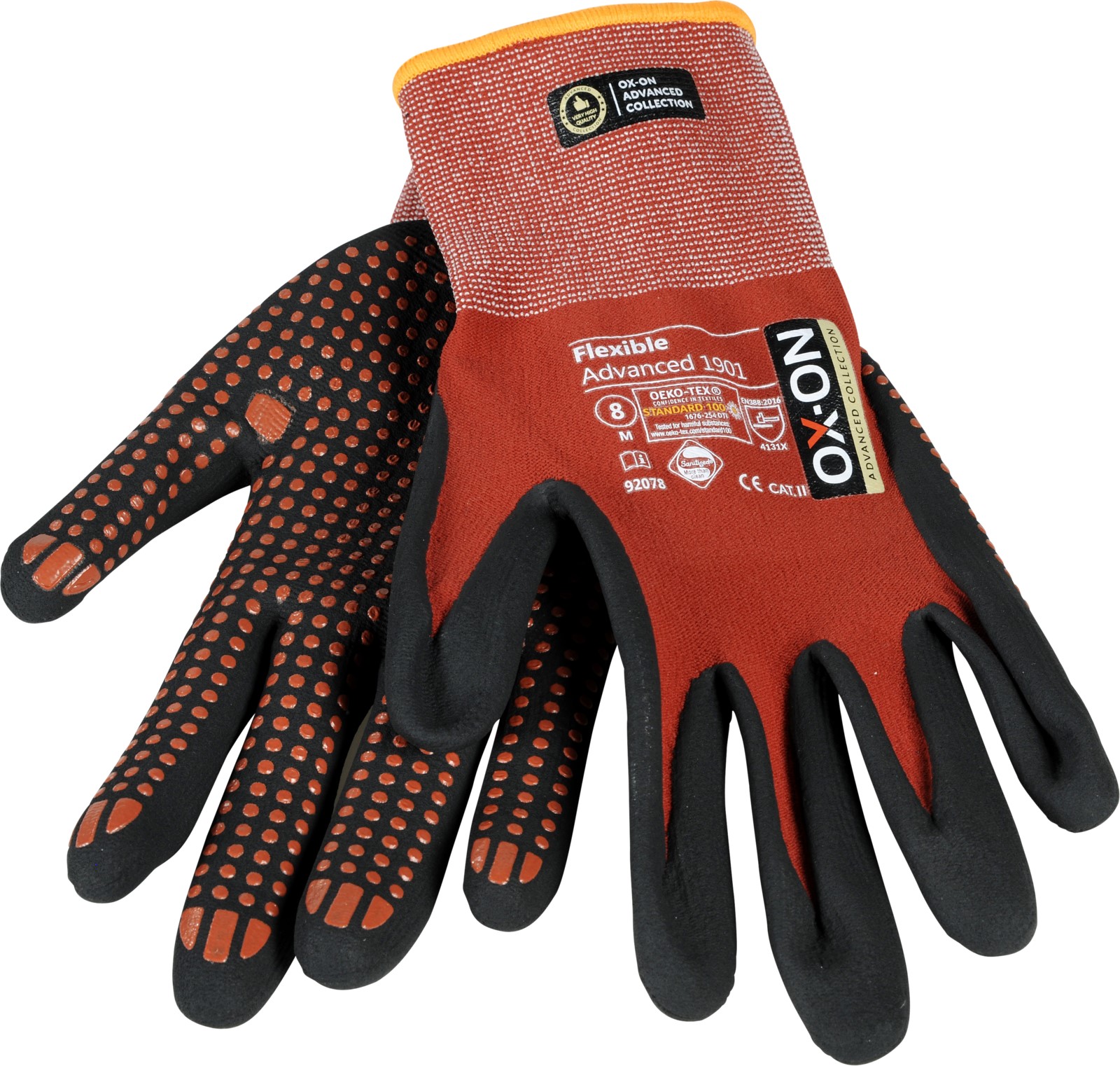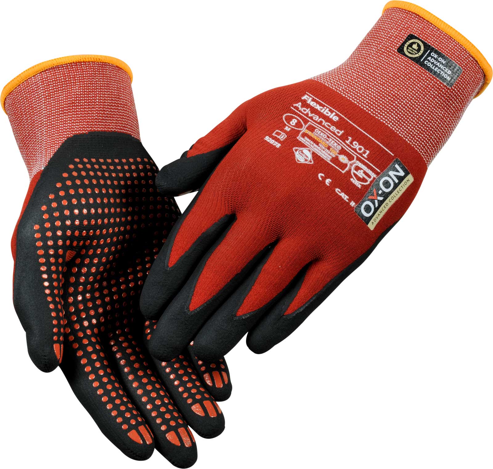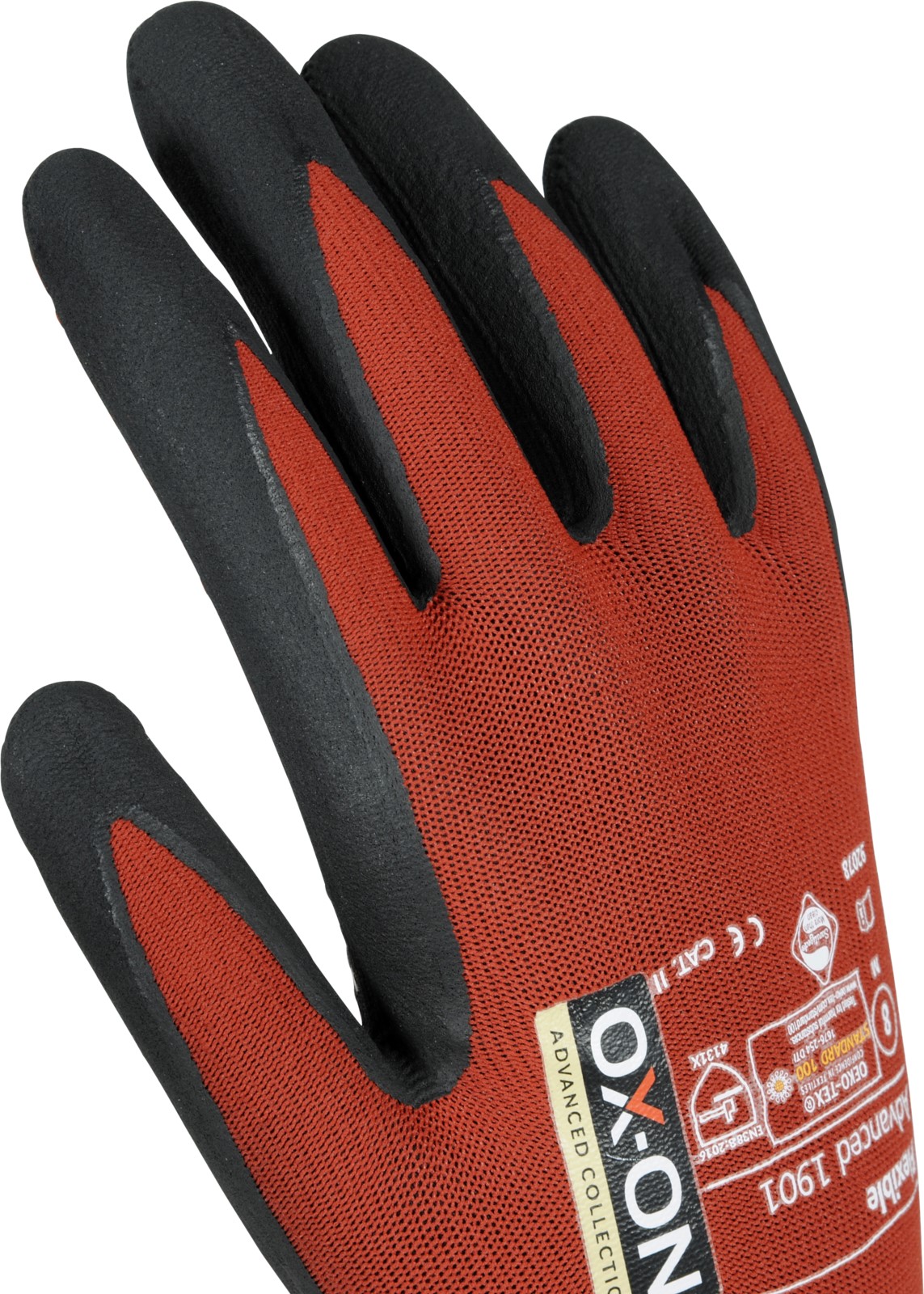 OX-ON Flexible Advanced 1901 is a work glove of the highest quality with nubs on the palm to give you an even better grip in dry and wet environments. The glove is extremely durable and fits as if it was made for your hand. The fit is outstanding and promises consistent comfort regardless of your activity. The fabric of the OX-ON Flexible Advanced 1901 consists of nylon and elastane. It therefore offers you unique breathability with unsurpassed flexibility and comfort. The palm and fingers are coated with a special nitrile foam that provides excellent tactile sensitivity and a precise, secure grip. The Advanced 1901 glove is OekoTex certified. This is your guarantee that the glove does not contain any chemicals or dyes that are hazardous to health or the environment. In addition, the glove is Sanitized, which means it feels fresh for longer and protects you from germs and sweat odors. A special glove in a class of its own!