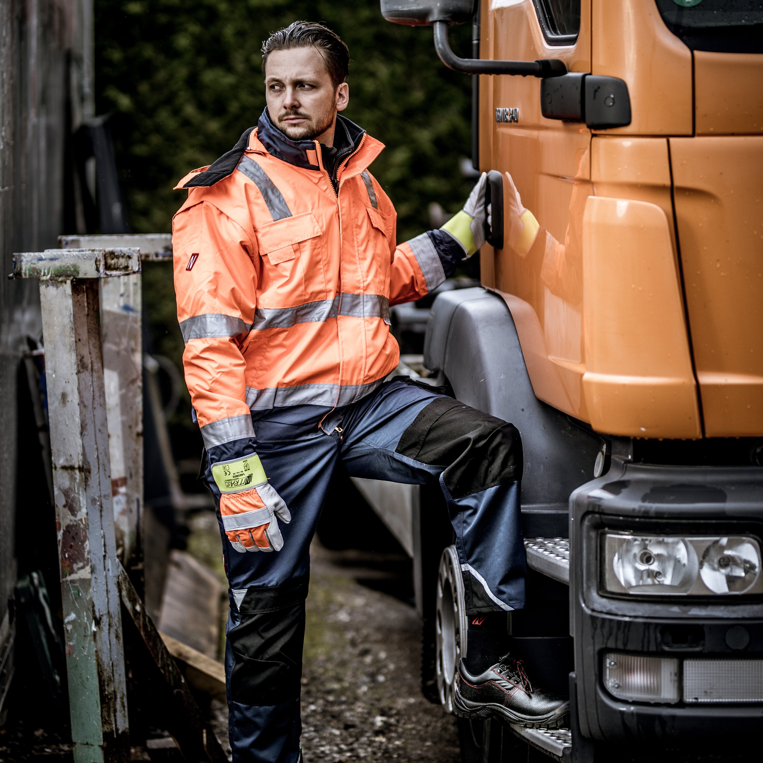 NITRAS cowhide full leather gloves, textile back, neon orange, cowhide full leather, grey, palm lining, rubberized cuff, neon yellow, double seams, signal colours, reflective elements