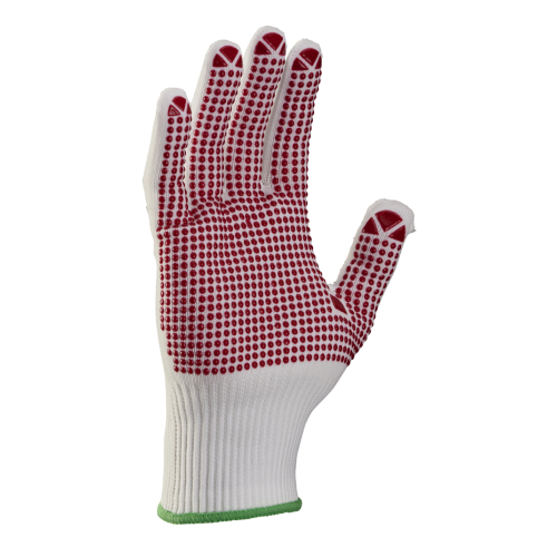 - white nylon fine knitted glove with red PVC studs
