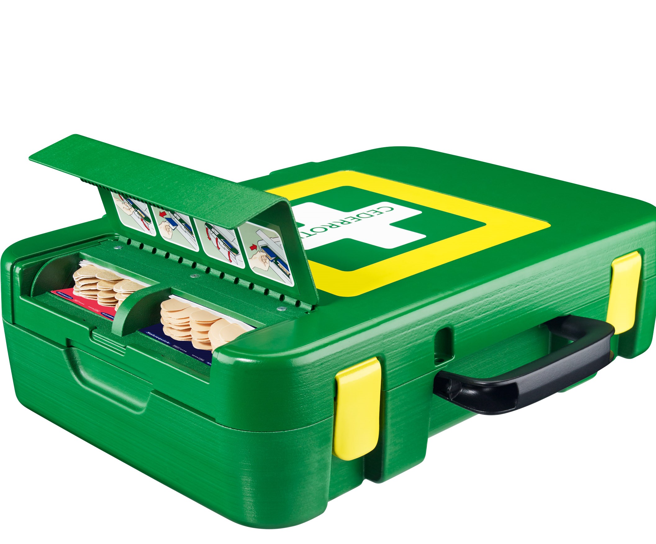 The Cederroth First Aid Kit DIN is generously sized and well stocked. The contents of the first aid kit meet all the requirements of DIN standard 13157. The kit is made of hard plastic, which keeps out dust, moisture and dirt even in stressful environments. The plaster dispenser on the outside makes it easy to remove plasters.