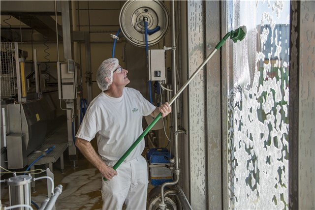 Ergonomic, adjustable angle brush with water flow. Can be set to 4 angles. Well suited for walls and machines in the food industry and delicate surfaces. Bristle length 44 mm.