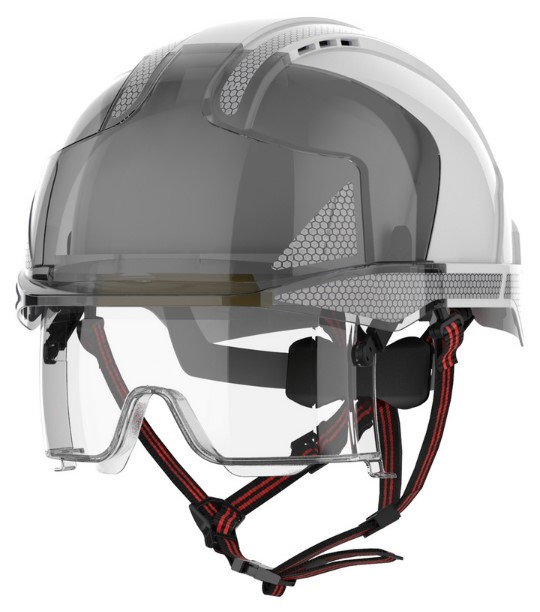 Variable industrial and climbing helmet, switch up - working on the ground according to EN 397, switch down - working at height according to EN 12492, ventilated, rotating ratchet, EEP inner shell, Dualswitch™ chin strap system, integrated safety glasses class 1, swivel bracket for extending and retracting the over-glasses.