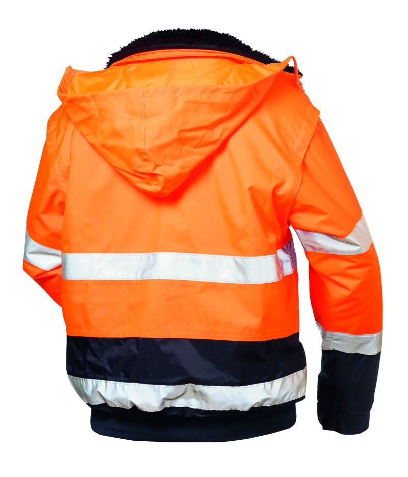 Standard: EN ISO 20471 class 3 (vest separate class 2), EN 343 class 3, EN ISO 13688 Upper: 100% polyester oxford, breathable PU coating Breathability: 2,000 g/m²/24h Water column: 2.000 mm sleeve lining: 100% polyester Fibre fur: 70% Polyacryl/30% Polyester Sizes: S-XXXXL Colour: fluorescent orange/navy 4-in-1 function Removable collar and sleeves, removable fur lining Material is wind and watererdi Welded seams Reflective stripes from 3M™ Scotchlite™ Reflective material Hood integrated in collar Adjustable cuffs with press studs Knitted waistband end at hem front zipper covered with flap easy emblem application due to zipper in the lining Bags: 1 sleeve pocket with zipper 2 breast pockets with flap, right side with attached pen pockets and mobile phone pocket 2 side pockets 1 inside pocket PU: 10 pieces