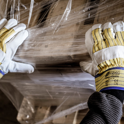 NITRAS POSEIDON, full cowhide leather gloves, cotton back, yellow / blue striped, full cowhide leather, gray, palm lining, rubberized cuff