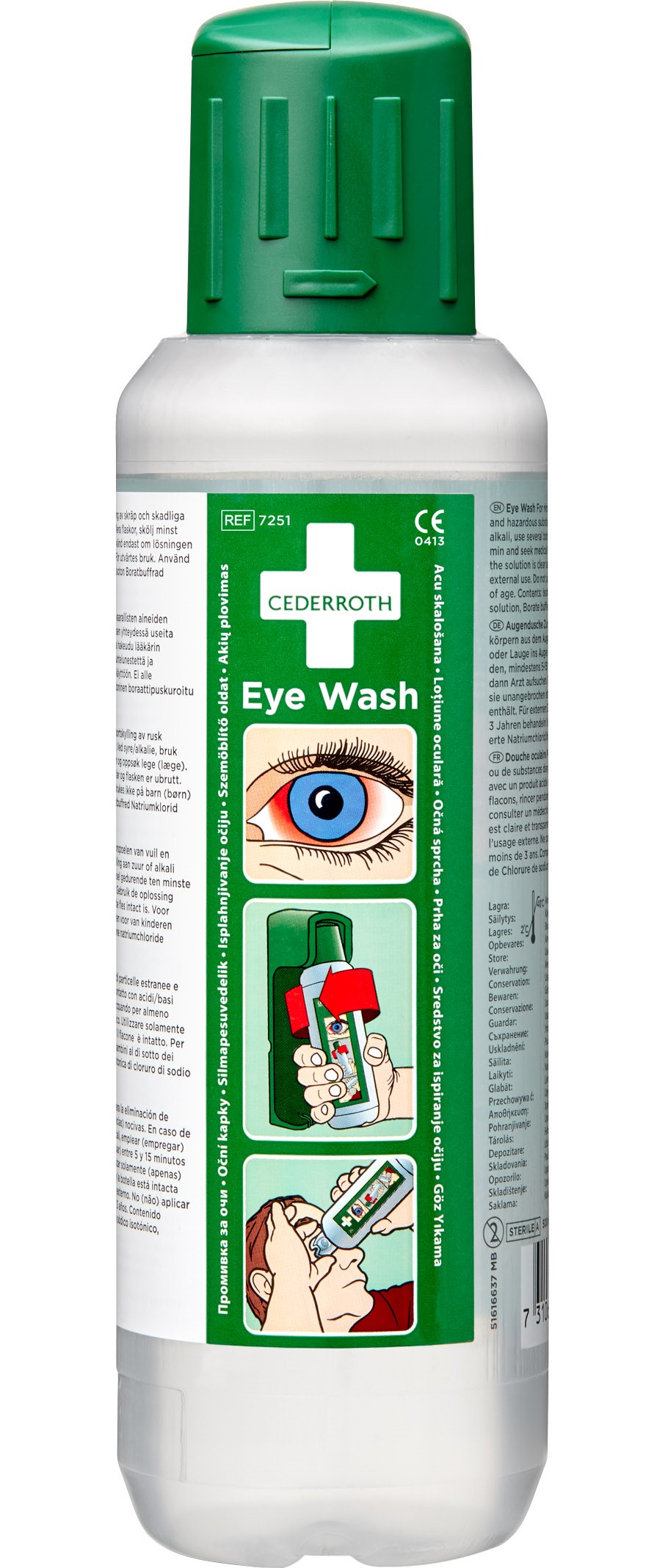 The Cederroth eye rinsing solution balances the pH value in the eye, i.e. it neutralizes alkali and acid splashes. It works faster than conventional saline solution. The effect is generally stronger with alkalis than with acids. Shelf life: An impressive 4.5 years. In case of accidents with calcareous substances (e.g. cement, concrete or lime) the Cederroth Eye Wash can be used for rinsing without any worries: for an optimal rinsing the eye rinsing solution is 100% phosphate-free.