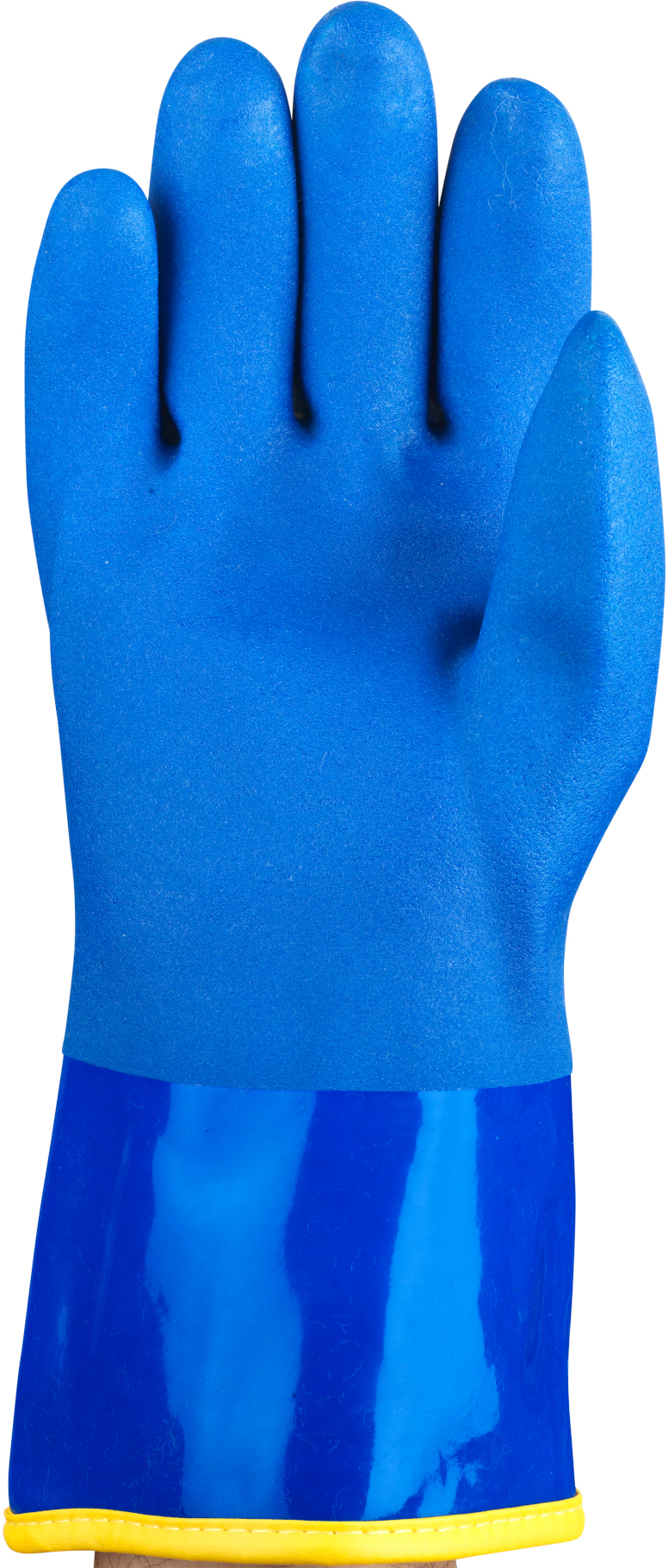Geraute Handfläche, glatte Stulpe. Kälteschutz bis ca. -30° C. Sofortige Wahrnehmung der Hitze beim Tragen des Handschuhs. Gute Griffsicherheit bei rutschigen und nassen Materialien. Chemikalienfeste PVC-Beschichtung.
