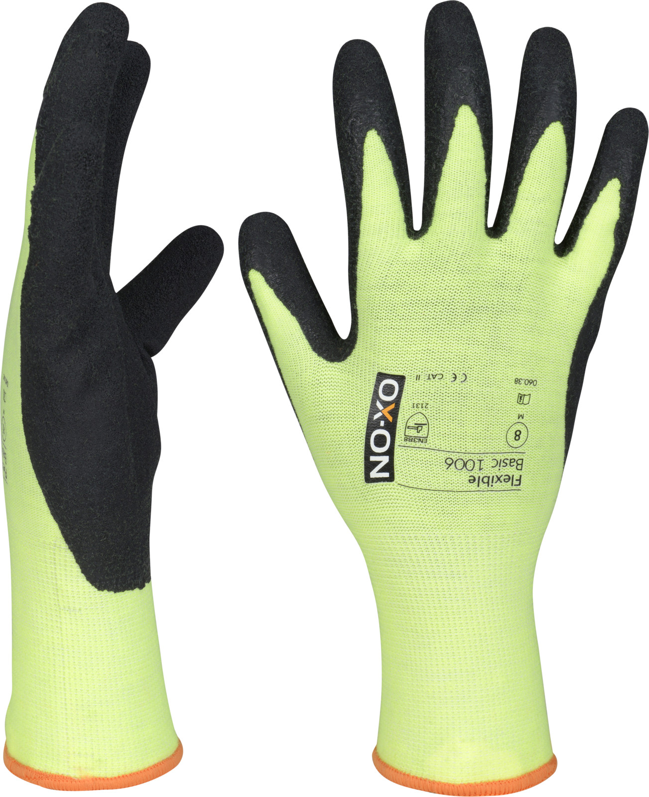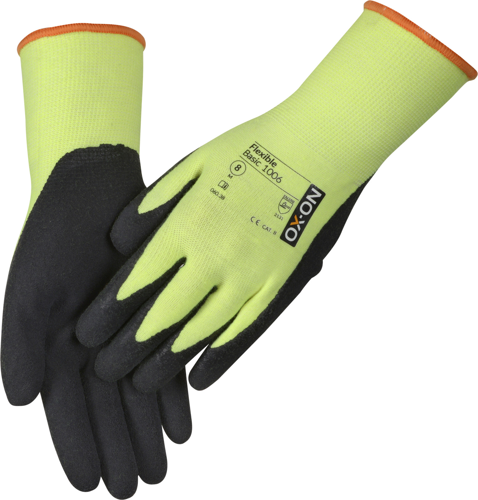 Der OX-ON Flexible Basic 1006 ist ein komfortabler und preiswerter Übergangshandschuh für alle, die zum Beispiel als Tischler, Bauarbeiter, im Lager oder im Garten arbeiten. Egal, ob Sie den flexiblen Handschuh professionell oder privat tragen. Sie erhalten einen leichten Allroundhandschuh, der in einer kühlen Umgebung gut funktioniert. Die Handfläche und die Finger sind mit Latexschaum überzogen, der für ein extrem weiches und geschmeidiges Gefühl sorgt. Der Strick besteht aus Baumwolle und Elasthan, wodurch der Handschuh elastisch wird und Ihre Hände warm bleiben. Der Flexible Basic 1006 bietet hohen Komfort, eine ergonomische Passform und ein perfektes Tastgefühl. Der Flexible Basic 1006 ist der Allround- und Übergangshandschuh
