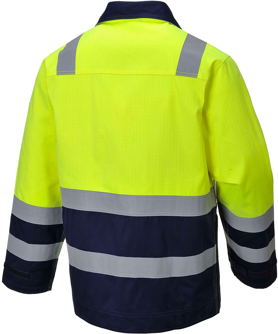Der zweifarbige Modacryl Stoff, zusammen mit den reflektierenden Streifen, bietet dem Träger erweiterte Sichtbarkeit und vollen Schutz in Gefahrensituationen. Das verbesserte Design erfüllt die strengen Anforderungen der des Lichbogenschutzes.
